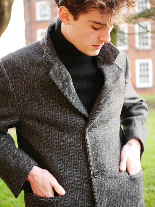 Vintage American Kuppenheimer 100% Pure Wool Grey Herringbone Overcoat Large